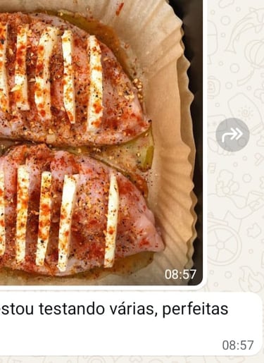 Você vai receber 4 cardápios prontos, com receitas de AirFryer testadas, rápidas e saborosas — organizadas pra você não perder tempo pensando, nem repetindo prato. Basta abrir o celular e escolher. Literalmente, em segundos.